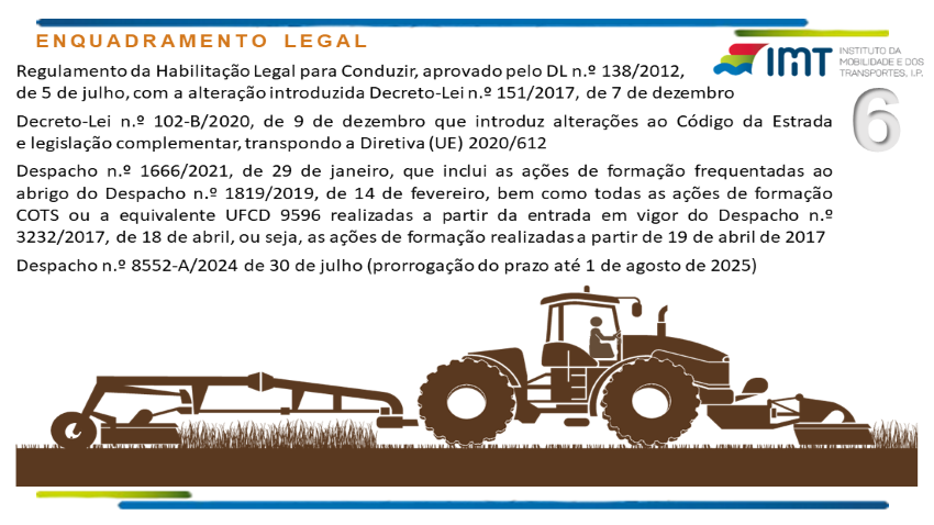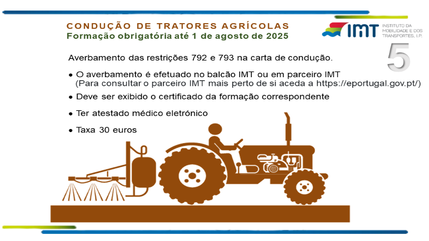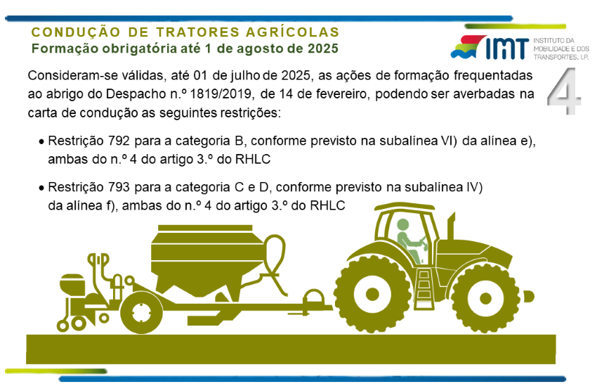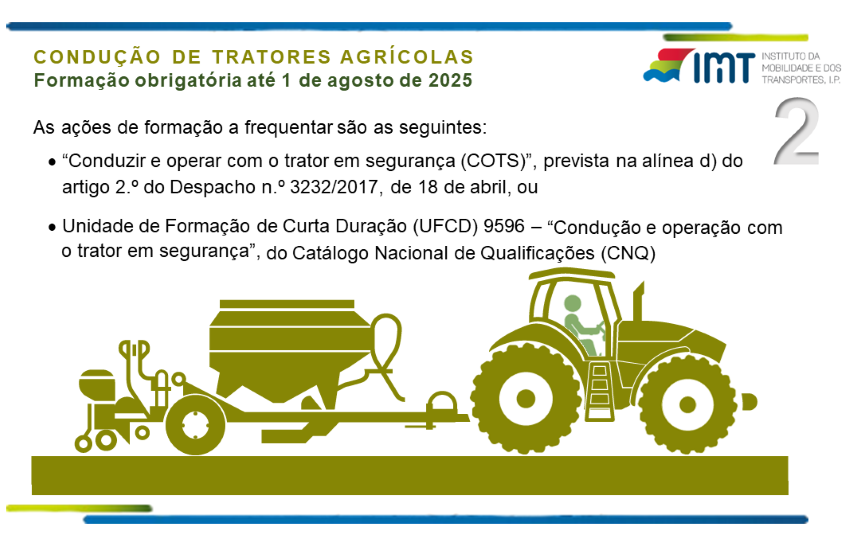 A partir de 1 de agosto de 2025, os condutores habilitados para as categorias B que pretendam conduzir veículos agrícolas do tipo II e os condutores habilitados para as categorias C e D que pretendam conduzir veículos agrícolas do tipo III, têm que ter frequentado com aproveitamento a ação de formação COTS (Conduzir e Operar com o Trator em Segurança) ou da equivalente UFCD (Unidade de Formação de Curta Duração), reconhecida nos termos do artigo 5.º do Despacho n.º 3232/2017, de 18 de abril.
