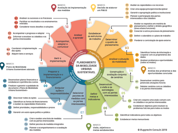A elaboração de um PMUS é um processo cíclico realizado em 4 fases, compostas por 12 etapas principais, divididas em 32 atividades. Todas as quatro fases do ciclo começam e terminam com um marco, associado a uma decisão ou um resultado necessário para o início da próxima fase, e que marca a conclusão da fase anterior.
