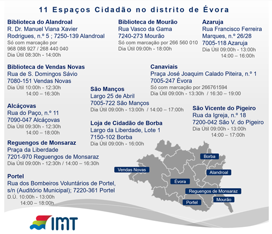 Para Revalidação, 2ª Via ou Duplicado, Substituição da Carta de Condução, Averbamento do Grupo 2 (Restrição 997 na Carta de Condução)., também pode ir a um dos 11 Espaços Cidadão no distrito de Évora, identificados na imagem abaixo.