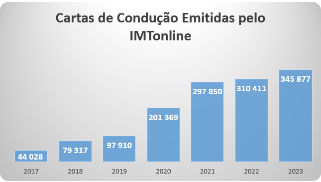 Desde o lançamento do IMT Online, em 2017, foram registados um total de 1.376.762 pedidos relativos a cartas de condução, 23.327 pedidos de cartão de estacionamento para pessoas com deficiência condicionadas na sua mobilidade, 76.794 pedidos de 2.ª via de certificado de matrícula e também 37.662 pedidos de alteração de cor de veículos, entre outros. Em setembro de 2019, o Instituto da Mobilidade e dos Transportes (IMT) digitalizou ainda o pedido de cartão tacográfico de condutor que, até ao final de 2023, registou um total de 93.260 pedidos.