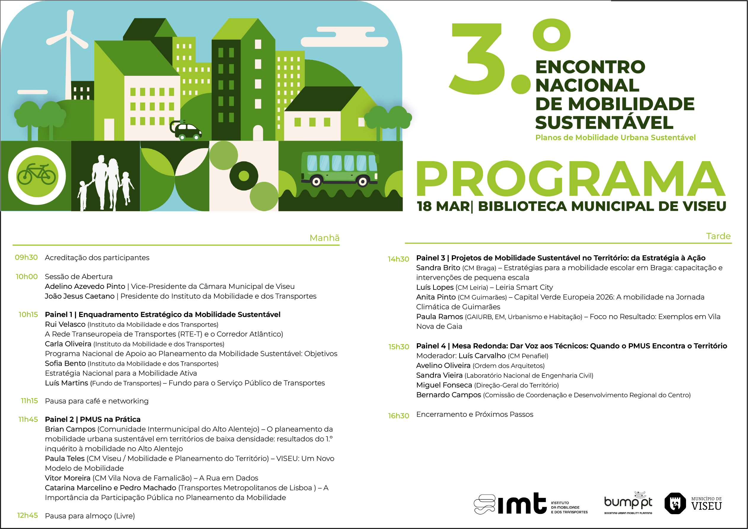 O IMT – Instituto da Mobilidade e dos Transportes promove, em parceria com o Município de Viseu, a 18 de março de 2026, o 3.º Encontro Nacional de Mobilidade Sustentável, dedicado aos Planos de Mobilidade Urbana Sustentável (PMUS).