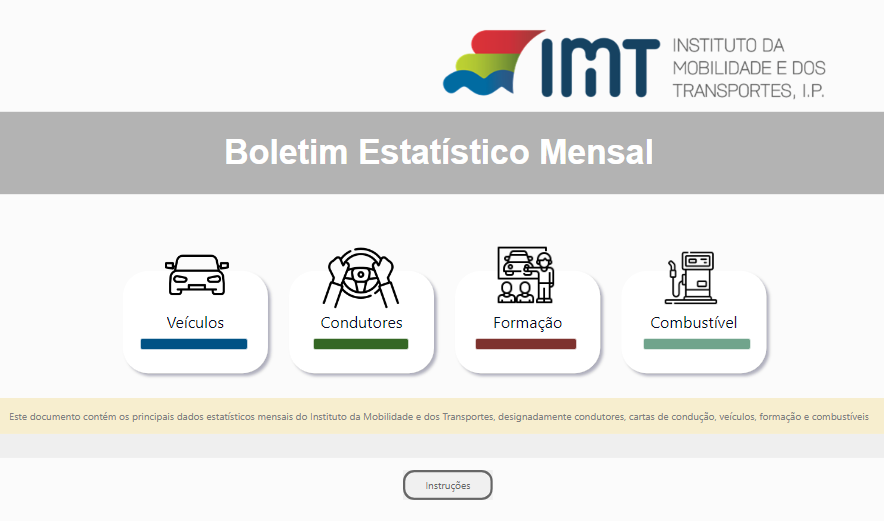O Instituto da Mobilidade e dos Transportes (IMT) apresenta uma nova versão do seu Boletim Estatístico Mensal, que permite aceder aos dados mais atualizados sobre veículos matriculados, perfil dos condutores, aspetos alusivos à formação e características da frota nacional de veículos por tipo de combustível.