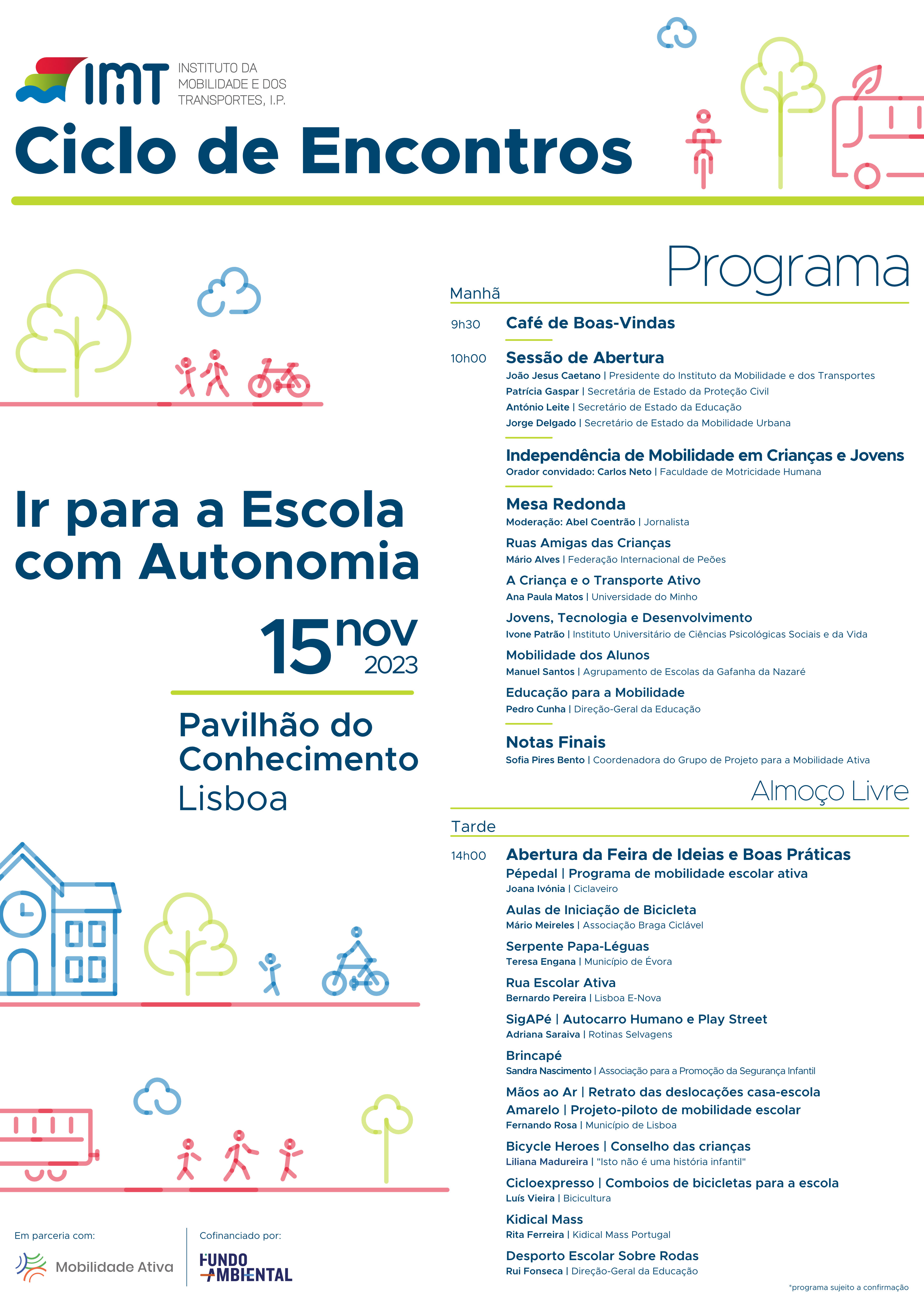 O encontro “Ir Para a Escola com Autonomia” decorre em parceira com o Grupo de Projeto para a Mobilidade Ativa, vai contar com uma Feira de Ideias e Boas Práticas, onde estarão reunidos promotores de 12 projetos pioneiros no nosso país, e vai trazer ao debate especialistas na temática e ainda outras visões sobre mobilidade em idade escolar.