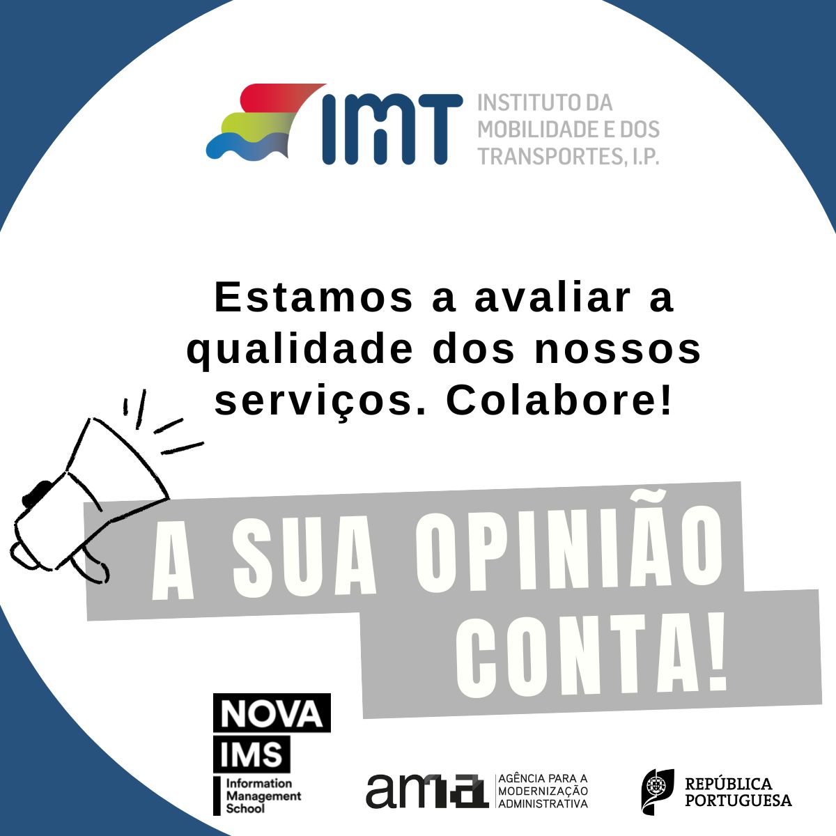 O Instituto da Mobilidade e dos Transportes (IMT) está a avaliar a qualidade dos serviços prestados através dos diferentes canais de atendimento, numa iniciativa que decorre, até ao próximo dia 22 de abril, através dos nossos canais digitais e ainda nos nossos balcões de atendimento presencial.